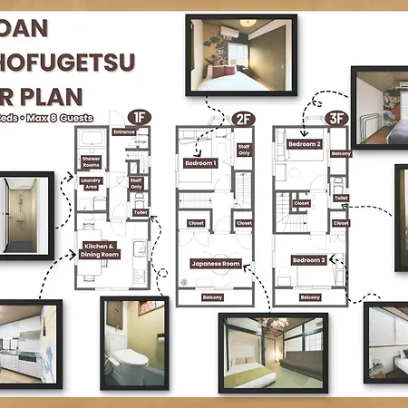 Die Unterkünfte bietet eine Sitzecke mit einer Klimaanlage für höchsten Komfort. In der Ferienwohnung Ukiyoan Kachofugetsu steht den Gästen ein Badezimmer mit einem Haartrockner, Handtüchern und Hausschuhen zur Verfügung. Außerdem findet man hier ein Bidet, eine getrennte Toilette und eine Dusche.